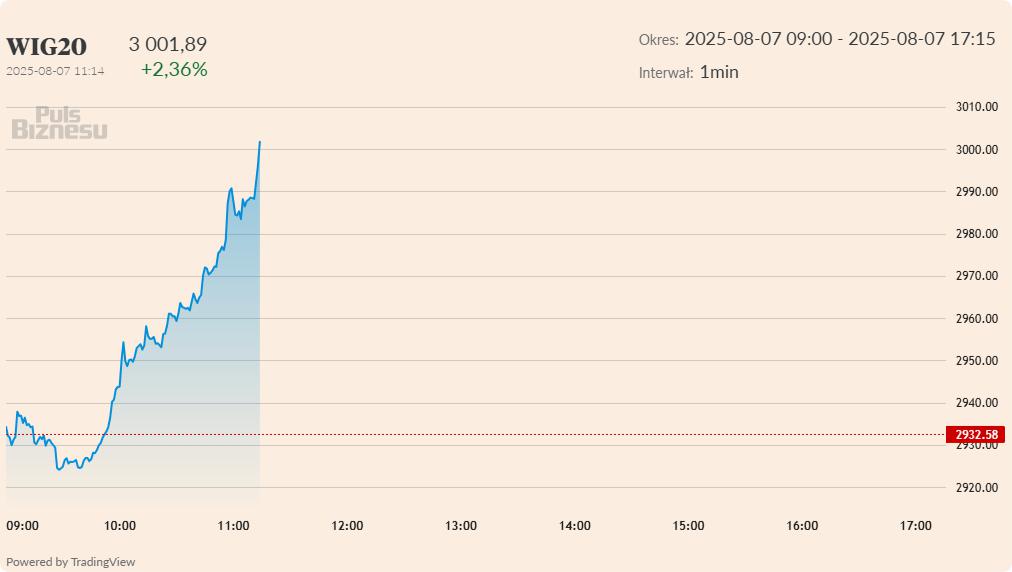 To, co kilkukrotnie nie udało się w ostatnich dniach, powiodło się w końcu w czwartek, 7 sierpnia, o godz. 11:14. WIG20 osiągnął wartość 3001,89 pkt po wzroście o 2,36 proc. Na pierwszej linii drożały akcje banków i KGHM, ale mocną zwyżkę notowały także m.in. akcje Budimeksu i spółek ukraińskich, jak Astarta, Milkiland czy KSG Agro. Wszystko za sprawą doniesień budzących nadzieję na zakończenie wojny w Ukrainie.