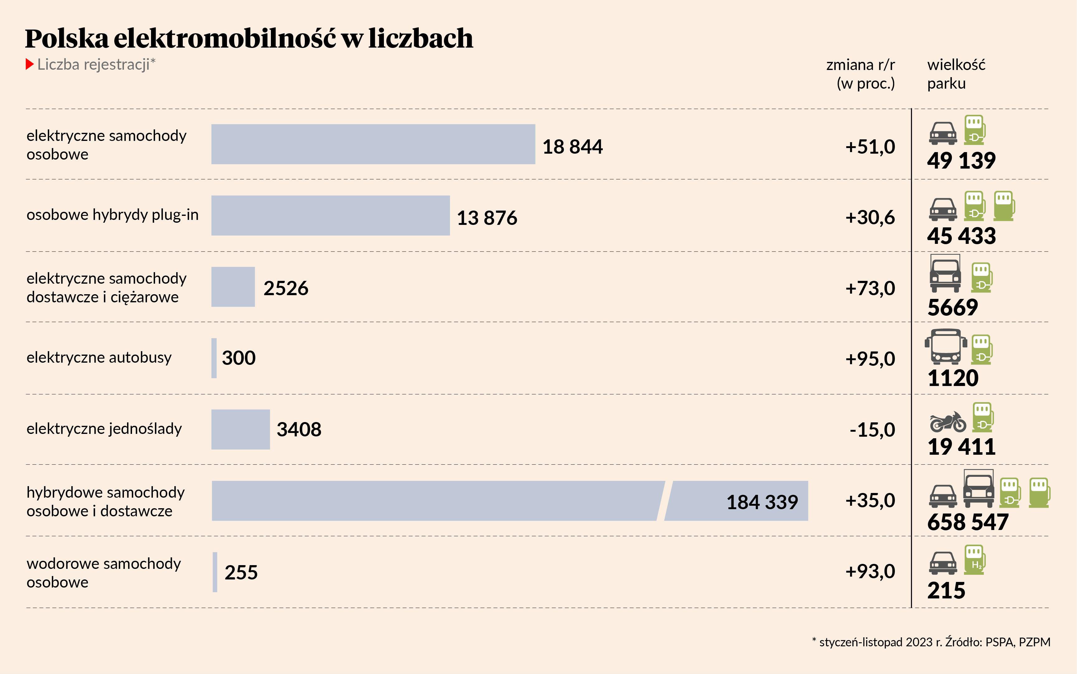 Z najnowszego Licznika elektromobilności, czyli comiesięcznego zestawienia przygotowywanego przez Polski Związek Przemysłu Motoryzacyjnego (PZPA) i Polskie Stowarzyszenie Paliw Alternatywnych (PSPA), pod koniec listopada 2023 r. po polskich drogach jeździło prawie 94,6 tys. aut osobowych z napędem elektrycznym (elektryków i hybryd plug-in). Flota aut w pełni elektrycznych liczy już ponad 49,1 tys., a hybryd plug-in nieco ponad 45,4 tys. Liczba samochodów dostawczych i ciężarowych z napędem elektrycznym to blisko 5,7 tys. Po polskich drogach jeździ też ponad 19,4 tys. elektrycznych jednośladów (motorowerów i motocykli) oraz ponad 1,1 tys. e-autobusów. Park samochodów z napędem alternatywnym tworzą również klasyczne hybrydy — jest ich zarejestrowanych blisko 658,6 tys.