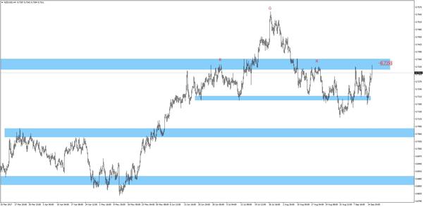 Obecnie spoglądałbym pilnie w stronę 0,7350, gdzie pojawia się poziomy opór wynikający z price action (nota bene potwierdzony po raz kolejny dzisiejszym, porannym testem i cofnięciem). W tej sytuacji można założyć, że ewentualne sforsowanie tej bariery byłoby sygnałem, który kończyłby prowadzoną od lipcowego szczytu korektę.