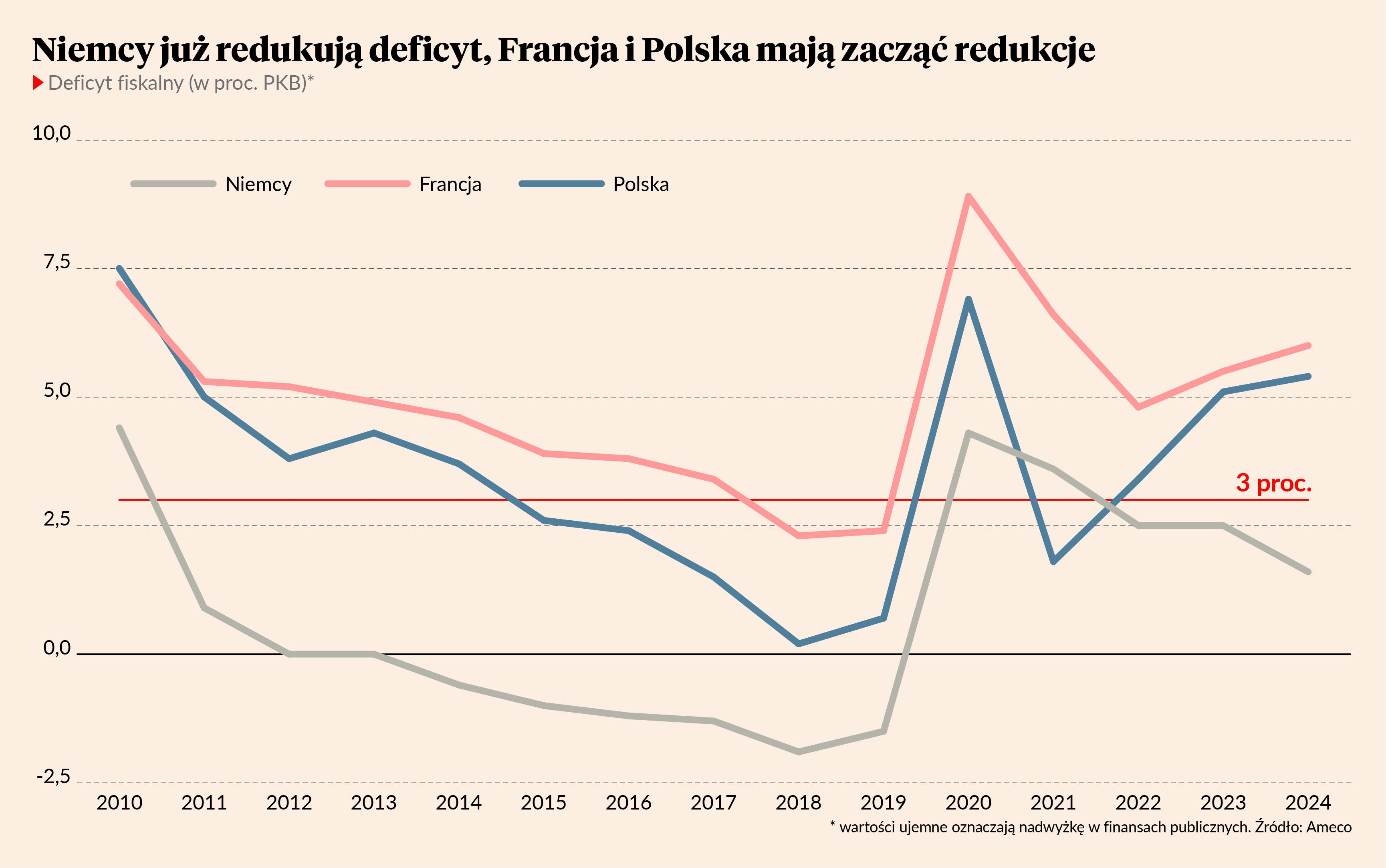 Niemcy nie muszą nikomu przedstawiać planów oszczędnościowych, bo oni zaczęli redukcję deficytu dwa lata przed wszystkimi i nie są objęci procedurami UE. Redukują deficyt, nie zważając na recesję, niskie inwestycje, opóźnienia w transformacji energetycznej, wyzwania związane z bezpieczeństwem militarnym Europy. Ich deficyt zbliża się już do 1 proc. PKB i jest jednym z sześciu najniższych wśród krajów UE.