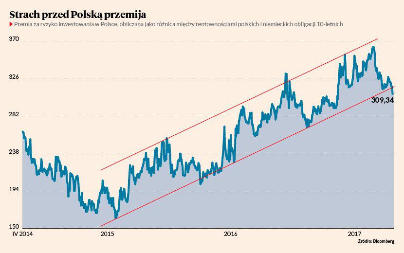 Ożywienie gospodarcze w kraju, korzystny wynik wyborów we Francji oraz wzrost globalnego apetytu na ryzyko zachęcają zagranicznych inwestorów do inwestowania w polskie aktywa. Widać to po różnicy w rentownościach 10-letnich obligacji polskiego i niemieckiego rządu. Ta różnica, interpretowana jako premia za ryzyko inwestowania w polskie aktywa (nie tylko w obligacje, ale też w akcje, na których wycenę wpływ ma koszt kapitału, związany z rentownością obligacji), spadła po pierwszej turze wyborów we Francji najniżej od pięciu miesięcy. To może oznaczać koniec trwającej od ponad dwóch lat tendencji powiększania się polskiej premii za ryzyko, związanej ze słabym wzrostem i obawami o krajową politykę.