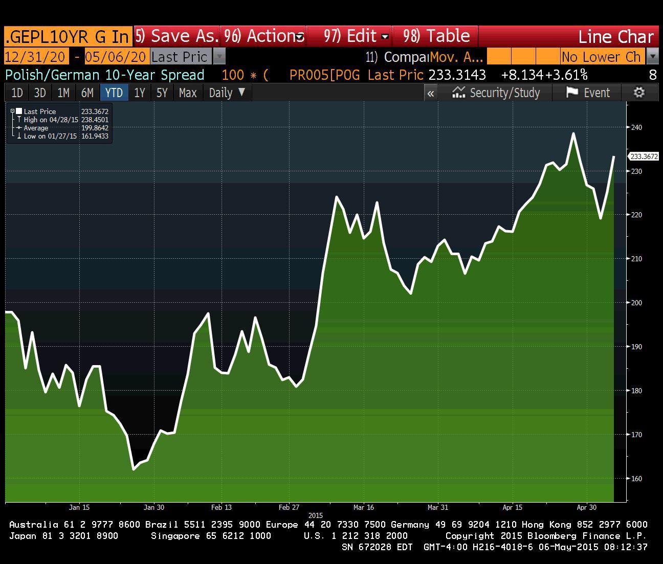 Premia, jakiej żądają inwestorzy aby trzymać obligacje 10-letnie Polski denominowane w złotych, a nie obligacje Niemiec o tym samym terminie zapadalności, osiągnęła 238 pkt bazowych 28 kwietnia. W styczniu wynosiła 162 pkt bazowe i była najniższa od siedmiu lat. W środę spread wynosił 231 pkt o 11:53 w Warszawie.