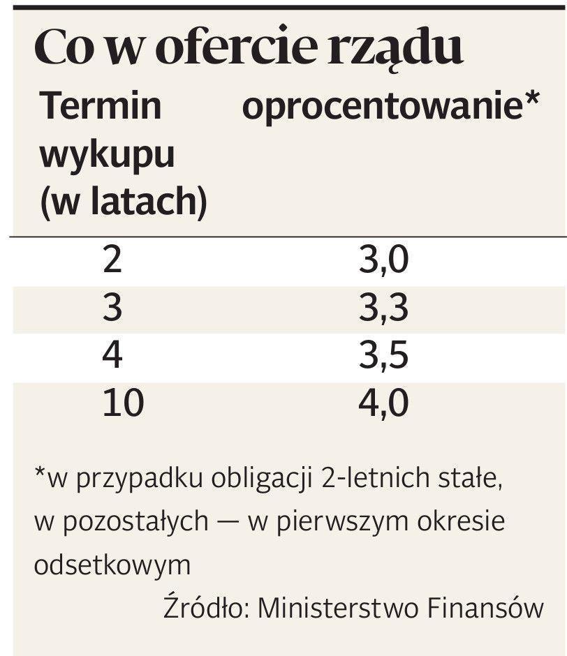— Najnowsze odczyty wskaźników makroekonomicznych pokazują, że polska gospodarka zaczyna wychodzić z dołka koniunkturalnego. Rosnący popyt wpłynie na wzrost cen, a tym samym inflacja będzie wyższa niż w ostatnich miesiącach — tłumaczy Tomasz Gomółka. Wzrost inflacji powinien oznaczać wzrost oprocentowania obligacji czteroletnich i dziesięcioletnich w kolejnych okresach odsetkowych. Oprocentowanie to będzie obliczane jako suma inflacji za ostatnie 12 miesięcy i marży, która wynosi 1,25 pkt proc. Żeby utrzymało się na obecnym poziomie, inflacja powinna wzrosnąć do 2,25 proc., a na razie szans na to nie ma. Jeżeli obecna projekcja NBP i prognozy analityków się sprawdzą, oprocentowanie papierów czteroletnich powinno wynosić 2,45 proc. Chyba że Ministerstwo Finansów podniesie marżę dla kolejnych emisji.