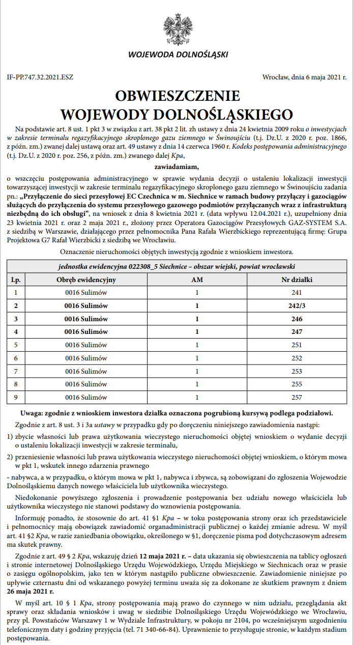 Obwieszczenie Wojewody Dolnośląskiego Komunikat partneraopublikowano: 2021-05-11 14:32IF-PP.747.32.2021.ESZ