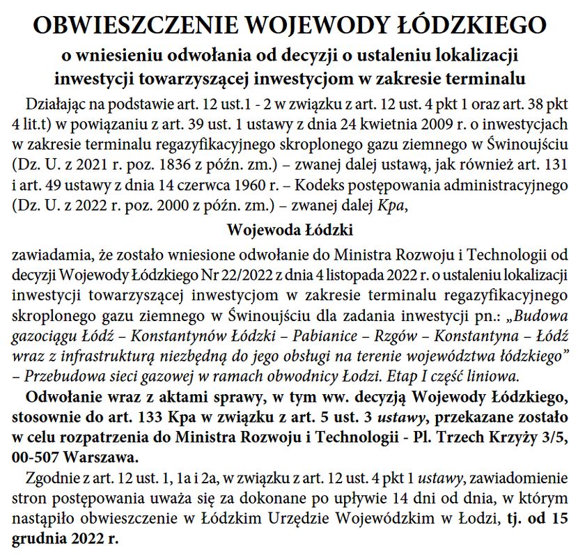 Obwieszczenie Wojewody Łódzkiego Komunikat partneraopublikowano: 2022-12-14 14:18PosłuchajZostań subskrybentemi słuchaj tego oraz wielu innych artykułów w pb.pl