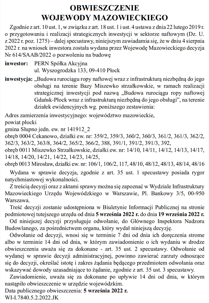 Obwieszczenie Wojewody Mazowieckiego Komunikat partneraopublikowano: 2022-09-02 13:57PosłuchajZostań subskrybentemi słuchaj tego oraz wielu innych artykułów w pb.pl