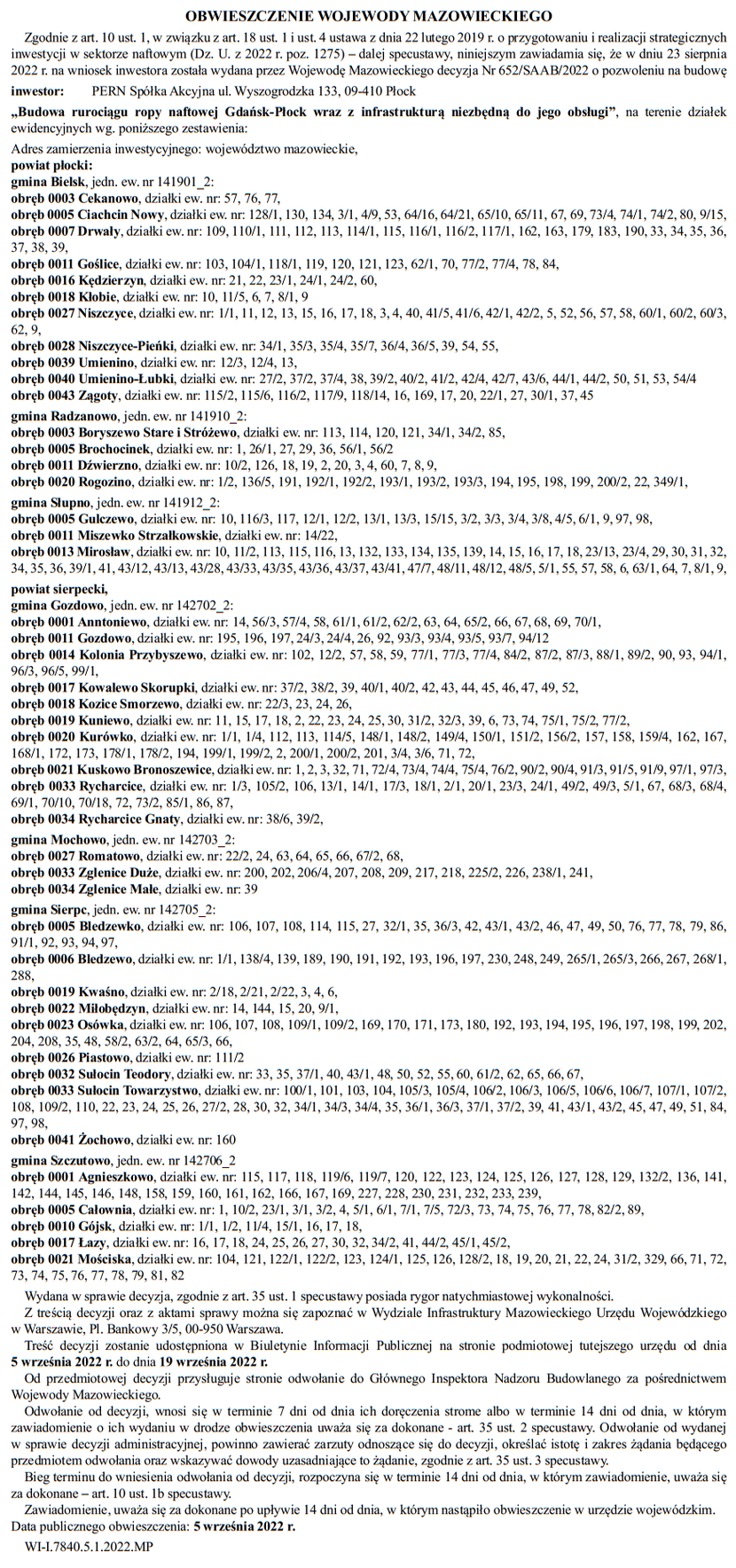 Obwieszczenie Wojewody Mazowieckiego Komunikat partneraopublikowano: 2022-09-02 14:02PosłuchajZostań subskrybentemi słuchaj tego oraz wielu innych artykułów w pb.pl