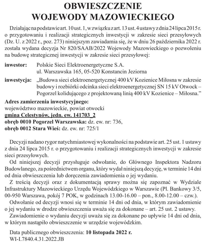 OBWIESZCZENIE WOJEWODY MAZOWIECKIEGO Komunikat partneraopublikowano: 2022-11-09 15:42PosłuchajZostań subskrybentemi słuchaj tego oraz wielu innych artykułów w pb.pl