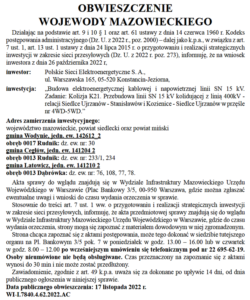Obwieszczenie Wojewody Mazowieckiego Komunikat partneraopublikowano: 2022-11-16 13:50PosłuchajZostań subskrybentemi słuchaj tego oraz wielu innych artykułów w pb.pl