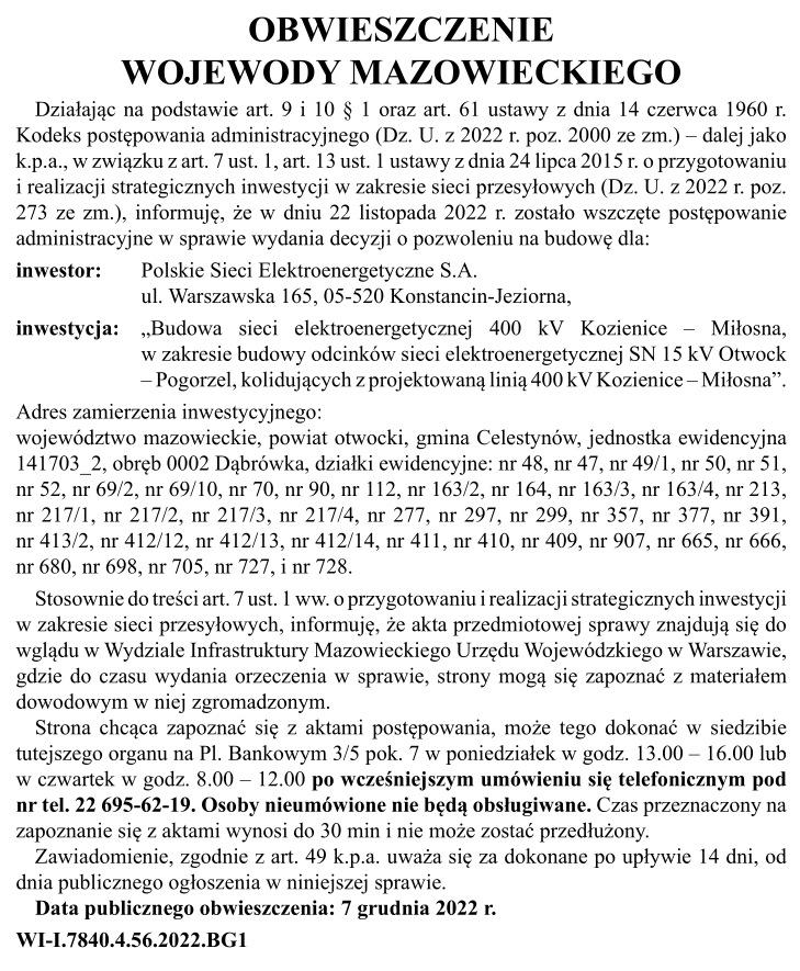 OBWIESZCZENIE WOJEWODY MAZOWIECKIEGO Komunikat partneraopublikowano: 2022-12-06 14:41PosłuchajZostań subskrybentemi słuchaj tego oraz wielu innych artykułów w pb.pl