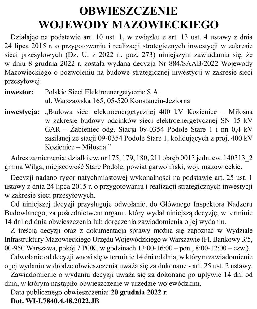 OBWIESZCZENIE WOJEWODY MAZOWIECKIEGO Komunikat partneraopublikowano: 2022-12-19 16:21PosłuchajZostań subskrybentemi słuchaj tego oraz wielu innych artykułów w pb.pl
