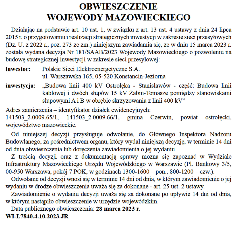 Obwieszczenie Wojewody Mazowieckiego Komunikat partneraopublikowano: 2023-03-27 14:27PosłuchajZostań subskrybentemi słuchaj tego oraz wielu innych artykułów w pb.pl