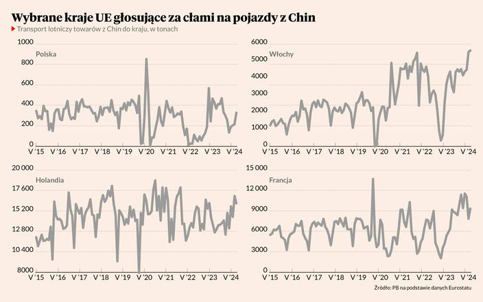 W okresie 2022-24 przewóz towarów transportem lotniczym z Chin do niektórych krajów UE wzrósł do najwyższego poziomu w historii. Wszystkie te państwa łączy albo niechęć do większego protekcjonizmu (Niemcy i Węgry), albo mocno ambiwalentny stosunek (Austria i Hiszpania). Tymczasem ten trend omija kilka krajów, które jawnie opowiadają się za zaostrzeniem barier handlowych — Polskę, Francję, Holandię, chociaż nie Włochy. Jest to o tyle ciekawe zjawisko, że ostatnio agencja Reuters poinformowała, iż rząd Chin nakazał swoim producentom samochodów wstrzymywanie dużych inwestycji w krajach UE, które popierają dodatkowe cła, i jednocześnie zachęcił do inwestowania w krajach, które głosowały przeciwko taryfom celnym. To sugeruje, że glokalizacja już się rozpoczęła i ma odzwierciedlenie w twardych danych. Chyba jeszcze bardziej wyraźną egzemplifikacją tego procesu jest fakt, że według danych fDi Markets chińskie inwestycje zagraniczne typu greenfield (czyli budowa przedsiębiorstwa od podstaw) w ostatnich latach zdecydowanie wzrosły w krajach UE, ale w tych spoza strefy euro, m.in. na Węgrzech.