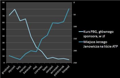 A oto obiecana relacja między notowaniami spółki a pozycją Janowicza w rankingu ATP w tym roku. Na razie sukces w Paryżu nie przyniósł przełomu w wycenie PBG - w poniedziałek i wtorek nadal spadała: