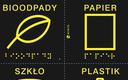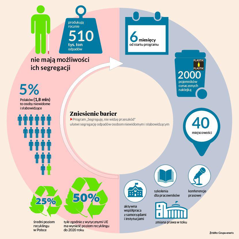 — W 2015 roku było 26 proc., a roczna zmiana wynosi zaledwie 0,7 proc. — przyznał wiceminister. Jan Jasiński, prezes Fundacji ProKarton, uważa, że wprowadzenie ujednoliconych kodów kolorystycznych dla pojemników i worków na selektywną zbiórkę umożliwi prowadzenie zakrojonych na szeroką skalę ogólnopolskich akcji edukacyjnych, co przełoży się na wzrost świadomości ekologicznej społeczeństwa i spowoduje zaangażowanie się gospodarstw domowych w segregację odpadów u źródła. Dobrym przykładem jest program „Segreguję — nie widzę przeszkód”. Jego autorem jest Eneris, firma z branży komunalnej, która wyszła z inicjatywą stworzenia oznaczeń na pojemniki zgodnych z zasadami projektowania uniwersalnego, czyli przyjaznego dla wszystkich, niezależnie od stanu zdrowia. Inspiracją był problem zgłoszony przez osoby z niepełnosprawnością wzroku. Pomysł był konsultowany z tym środowiskiem m.in. z Towarzystwem Opieki nad Ociemniałymi w Laskach oraz ze specjalistami z „Niewidzialnej Wystawy”. Rezultatem wspólnej pracy są naklejki na pojemniki na różne rodzaje odpadów (zgodnie z podziałem wchodzącym w życie od lipca): bioodpady, papier, szkło, plastik, baterie i odpady zmieszane. Każda z frakcji jest jednoznacznie opisana w alfabecie Braille’a, ma czytelny piktogram i wersję kontrastową ułatwiającą czytanie osobom niedowidzącym i starszym. Przez sześć miesięcy w całej Polsce naklejki w alfabecie Braille’a umieszczono w 2 tys. miejsc. Oznaczenia można spotkać w Warszawie, Wrocławiu, Łodzi, Krakowie, Poznaniu i niewielkich miejscowościach — Miasteczku Krajeńskim, Rydzynie, Darłowie. Są bezpłatnie dystrybuowane do mieszkańców, instytucji i organizacji publicznych, które zgłoszą zapotrzebowanie do Centralnego Biura Obsługi Klienta Eneris. Według danych GUS, w Polsce mieszka prawie 2 miliony osób niewidomych i słabowidzących, co stanowi około 5 proc. społeczeństwa. Rocznie te osoby wyrzucają 510 tys. ton odpadów, czyli więcej niż odbiera się śmieci w sumie w Pile, Gorzowie i Kielcach. Wciąż większość z tych osób każdego dnia napotyka trudności w segregacji odpadów.