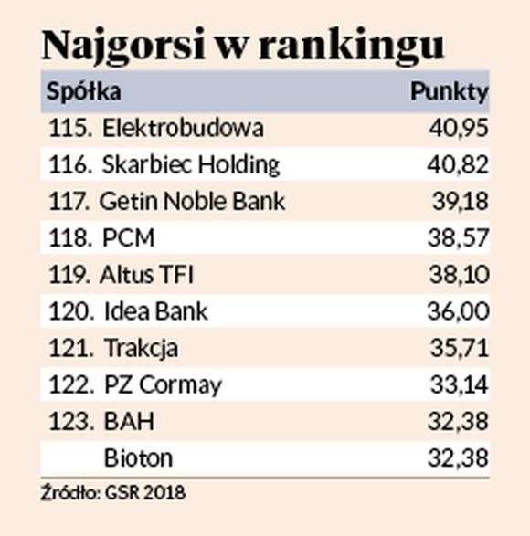 To jednak nie zmiana kursu, ale to, jak postrzegane są m.in. kompetencje zarządu, perspektywy i relacje z inwestorami decyduje o pozycji w rankingu. W Biotonie szwankuje przede wszystkim komunikacja z rynkiem — pod tym względem w WIG20, mWIG40 i sWIG80 nikt nie jest tak słaby. BAH zajął natomiast przedostatnie miejsce w kategorii „sukces”, bo miniony rok był dla spółki porażką — ze współpracy importerskiej z firmą zdecydował się wycofać Land Rover i Jaguar.