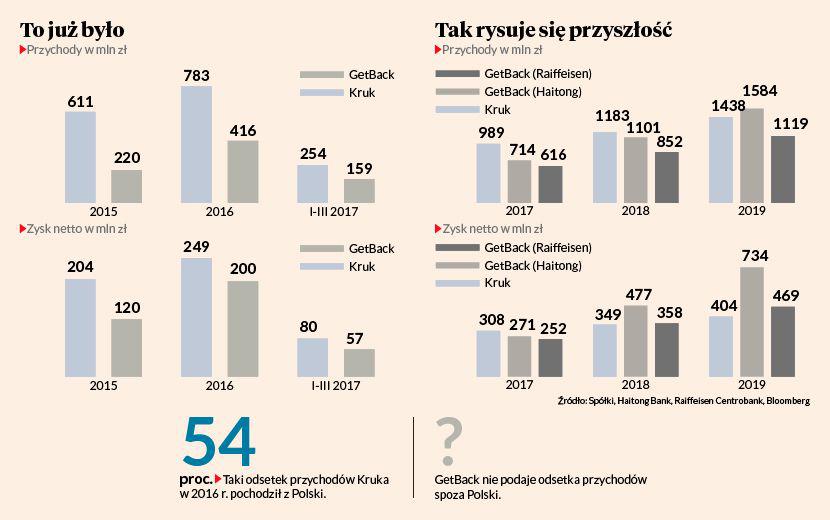 Do poniedziałku 3 lipca inwestorzy indywidualni mogą zapisywać się na akcje GetBacku, spółki, której zarząd celuje w pozycję lidera branży. — Obecnie jesteśmy numerem dwa, będziemy numerem jeden — zapewnia Konrad Kąkolewski, prezes GetBacku. Na akcjonariuszach Kruka, który wyrósł na potentata w sektorze, wrażenia te zapowiedzi nie robią. Od rozpoczęcia nieco ponad tydzień temu przez GetBack oferty publicznej kurs firmy, kierowanej przez Piotra Krupę urósł o prawe 4 proc. — trzy razy bardziej niż WIG. GetBack może się jednak pochwalić dużą dynamiką wzrostu. Pod względem nabyć portfeli, odzysków z portfeli własnych i zarządzanych, zysku netto za 2016 r., ustępuje jedynie… Krukowi. Zapowiada, że stanie się czołowym podmiotem windykacyjnym w Europie Środkowej i Wschodniej w ciągu trzech lat od debiutu. W tym samym okresie ma być „potencjalnie” do osiągnięcia skala Kruka. Analitycy Haitong Banku, będącego oferującym, oraz Raiffeisen Centrobanku, będącego współprowadzącym księgę popytu, przekonują, że dynamiczny rozwój GetBacku będzie kontynuowany. Z porównania ich opracowań z okazji oferty publicznej z konsensem prognoz dla konkurenta wynika, że już w 2019 r. zyski Kruka będą mniejsze od GetBacku. Kamil Stolarski z Haitong Banku zakłada przy tym, że przychody i zyski GetBacku w 2019 r. będą ponad 3,5 razy wyższe od tych z 2016 r. Jakub Krawczyk z Raiffeisena jest bardziej wstrzemięźliwy. Celuje w około 2,5-krotny wzrost skali biznesu GetBacku. Konsens prognoz agencji Bloomberg wskazuje przy tym, że ogół analityków wierzy również we wzrost Kruka. Jego zyski w 2019 r. mają wynosić 162 proc. tych z 2016 r.