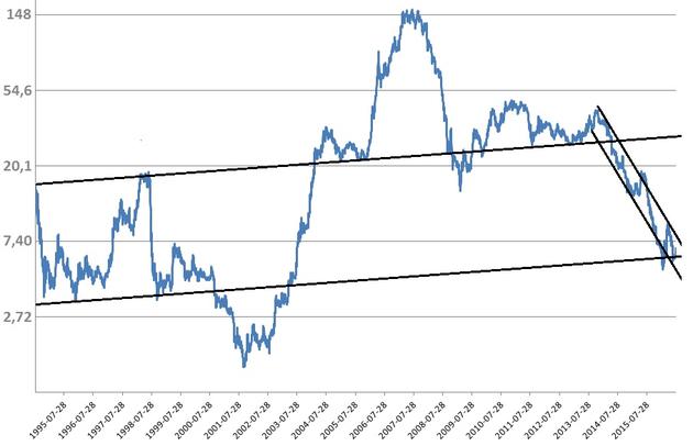 Teraz notowania mają szansę odbić od dolnego ograniczenia lekko rosnącego kanału, który można poprowadzić po wykresie, jeśli tylko pominie się okresy największego niedowartościowania i przewartościowania akcji szczycącej się 22-letnią historią giełdowych notowań spółki. Górne ograniczenie leży obecnie na wysokości 29 zł, co oznaczałoby jeszcze nawet 314-procentowy potencjał umocnienia. To oczywiście modelowe ujęcie, zakładające, że po przetestowaniu dolnego ograniczenia kanału notowania podążą w stronę górnego ograniczenia. Niestety, przy tak silnej tendencji spadkowej jak obserwowana ostatnio możliwy jest także powrót do gwałtownej bessy.