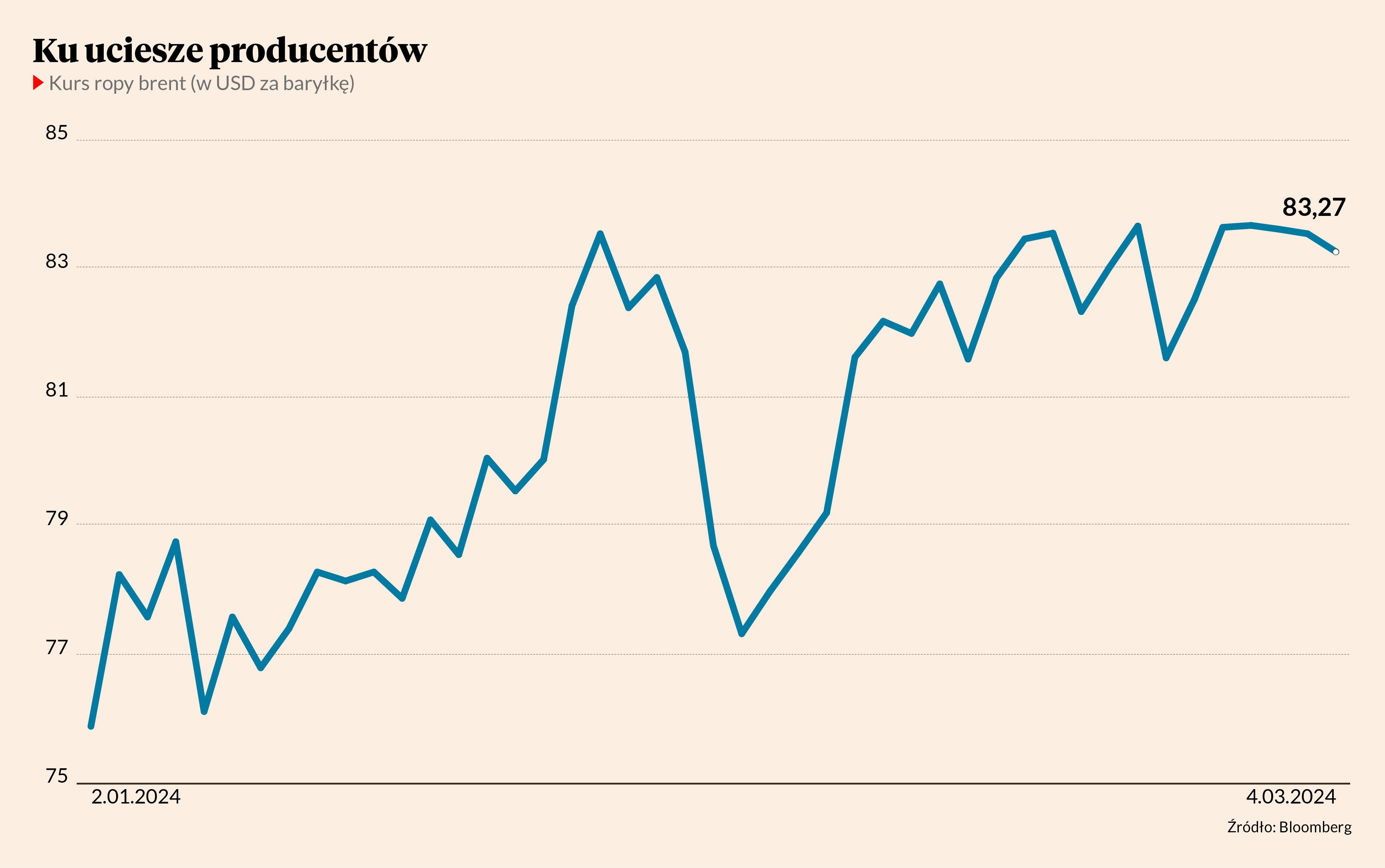 Wydobycie ropy będzie stopniowo ograniczane przez kolejne trzy miesiące — wynika z dokumentu opublikowanego przez państwa należące do organizacji OPEC+. Pełny efekt zmian ma być widoczny pod koniec czerwca, tuż przed letnimi wakacjami. Inwestorzy uwzględniają już w cenach trudności z dostępnością surowca. Kurs baryłki giełdowej ropy brent oscyluje w pobliżu 83 USD, a odmiana WTI po raz pierwszy od listopada 2023 r. przekroczyła psychologiczną barierę 80 USD.