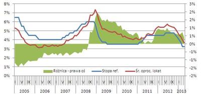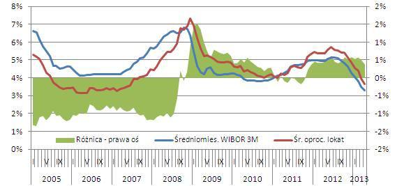 Rozpoczęta pod koniec 2008 r. wojna depozytowa przyzwyczaiła amatorów oszczędzania na bankowych lokatach do oprocentowania znacznie przekraczającego stopy procentowe. Na chwilę po upadku banku Lehman Brothers, kiedy rynek międzybankowy zamarł, a instytucje finansowe panicznie zabiegały o środki klientów, średnie oprocentowanie lokat o terminie zapadalności powyżej jednego miesiąca do trzech miesięcy włącznie (to najbardziej reprezentatywna statystyka w danych NBP dotycząca oprocentowania lokat) przekraczało średniomiesięczną stopę WIBOR nawet o 1,5 pkt proc., a stopę referencyjną o 2 pkt proc. W kolejnych miesiącach różnica ta topniała, by w 2011 r. zbliżyć się do zera. W 2012 r. średnia stawka lokat przekraczała średniomiesięczną stawkę WIBOR o ok. 0,5 pkt proc. i główną stopę procentową o ok. 0,8 pkt proc.