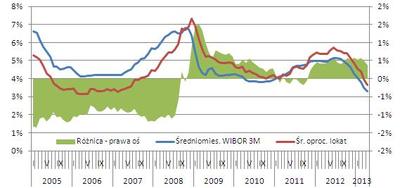 Od stycznia 2005 r. do sierpnia 2008 r. średnia różnica między oprocentowaniem depozytów terminowych, a stawką WIBOR wynosiła minus 1,01 pkt proc. Banki płaciły więc klientom za ulokowane oszczędności znacznie mniej niż same musiały płacić za pożyczenie środków od innych banków. Ujemną różnicę dało się zauważyć także w odniesieniu do stopy referencyjnej, od 2005 r. sukcesywnie malała ona z poziomu -1,45 pkt proc., aby w sierpniu 2008 r. znaleźć się tylko nieznacznie poniżej zera.