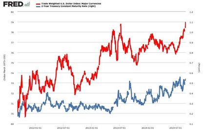 Indeks notowań dolara wobec pozostałych głównych walut, ważony wielkością wzajemnego handlu (linia czerwona), na tle rentowności 2-letnich obligacji amerykańskiego skarbu (linia niebieska). Źródło: Bloomberg.