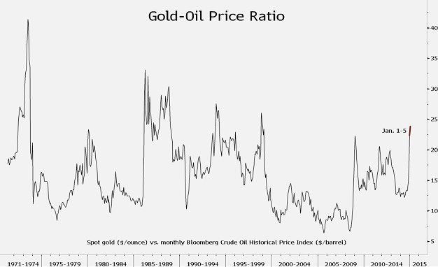 Według specjalisty współczynnik cen złota i ropy może sięgnąć ekstremalnych poziomów, jeżeli tylko przecena ropy będzie kontynuowana.