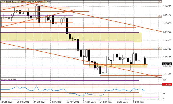 Nowy tydzień zaczyna się z nieco mocniejszym dolarem na szerokim rynku, co przekłada się na zachowanie EURUSD. Rynek czeka na sygnały z Fed, spekuluje się o podwojeniu skali taperingu (z 15 mld USD do 30 mld USD miesięcznie), oraz "jastrzębim" komunikacie zapowiadającym podwyżki stóp w 2022 r. Czy jednak, aby oczekiwania wobec Rezerwy Federalnej nie zawierają się już w wycenie dolara? Piątek dobitnie pokazał, że aby USD mógł wyraźniej zyskać potrzebne są jakieś mocniejsze zaskoczenia. Tymczasem poprzeczka oczekiwań na środę jest ustawiona wysoko. Nie oczekujmy, zatem podniesienia taperingu do 40 mld USD, czy też konkretnej zapowiedzi podwyżki stóp już w I półroczu 2022 r. Omikron może być dobrym wytłumaczeniem do tego, aby nie obiecywać za wiele.