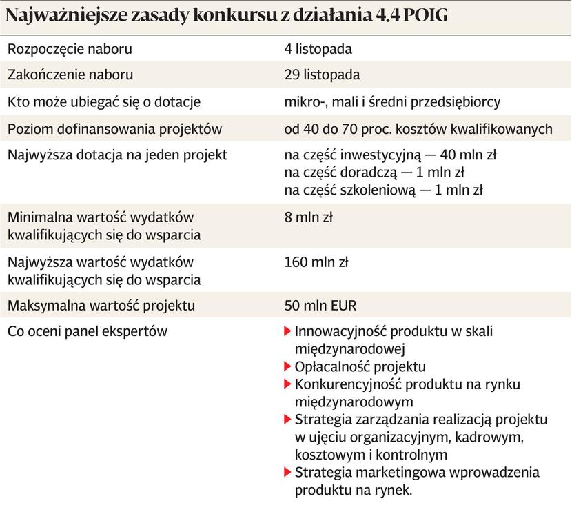 Bardzo dobra wiadomość dla firm, które zamierzają wprowadzić w życie nowe rozwiązania i chciałyby uzyskać na to zewnętrzne dofinansowanie. Na początku listopada wystartuje kolejny, nieplanowany wcześniej, nabór wniosków o dotacje z działania 4.4 „Nowe inwestycje o wysokim potencjale innowacyjnym” programu Innowacyjna Gospodarka. To jeden z najbardziej popularnych instrumentów wśród firm, jednak organizująca konkursowe zmagania Polska Agencja Rozwoju Przedsiębiorczości (PARP) nie rozpieszcza ich częstotliwością naborów. Na ten, który odbył się wiosną tego roku, przedsiębiorcy musieli czekać cztery lata. Przed tymi, którzy wtedy nie zdążyli złożyć wniosku, kolejna szansa — nowe rozdanie rozpoczyna się już 4 listopada.