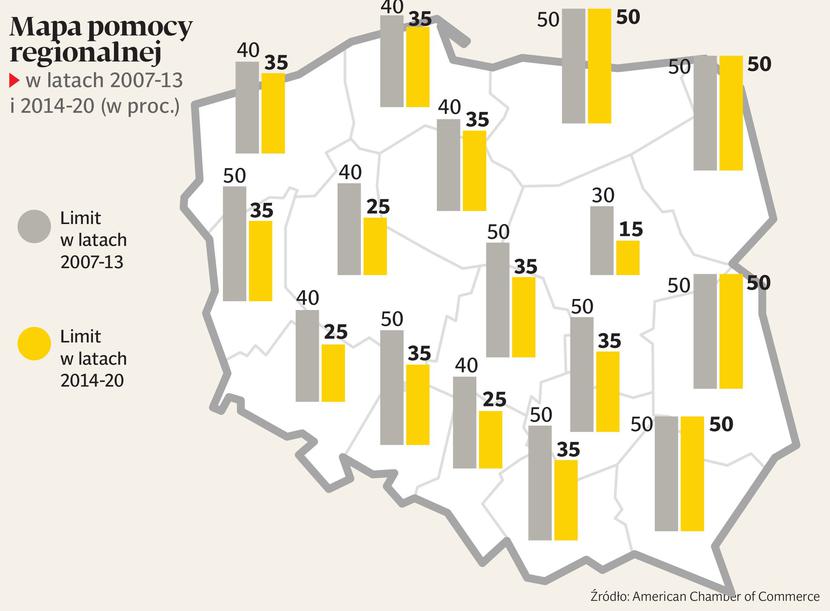 Możliwość zwolnienia z części podatku dochodowego CIT zależy m.in. od mapy pomocy regionalnej określonej przez Unię Europejską. Wysokość pomocy zależy od zamożności regionu, czyli od średniej wartości PKB na mieszkańca. Wsparcie regionalne w Polsce utrzymuje się na podobnym poziomie, ponieważ większość obszarów osiąga PKB niższe niż 75 proc. średniej unijnej. Dlatego tereny zamieszkałe przez 86 proc. Polaków będą podlegały pomocy wynoszącej od 25 do 50 proc. Szczególną pomoc uzyskają województwa wschodnie — lubelskie, podkarpackie, podlaskie i warmińsko-mazurskie.