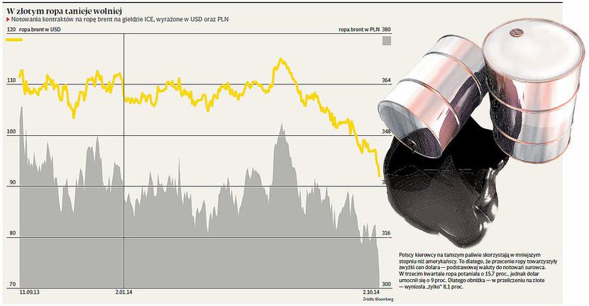 Polscy kierowcy na tańszym paliwie skorzystają w mniejszym stopniu niż amerykańscy. To dlatego, że przecenie ropy towarzyszyły zwyżki cen dolara — podstawowej waluty do notowań surowca. W trzecim kwartale ropa potaniała o 15,7 proc., jednak dolar umocnił się o 9 proc. Dlatego obniżka — w przeliczeniu na złote — wyniosła „tylko” 8,1 proc.