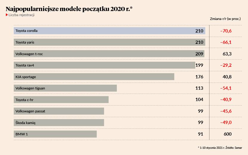 Liderem w grupie samochodów osobowych jest Toyota (871 szt.) przed Volkswagenem (591 szt.) i Skodą (426 szt.), a wśród modeli prowadzą ex aequo dwa auta Toyoty - corolla i yaris - z wynikiem po 210 szt., przed t-rokiem Volkswagena (209 szt.).