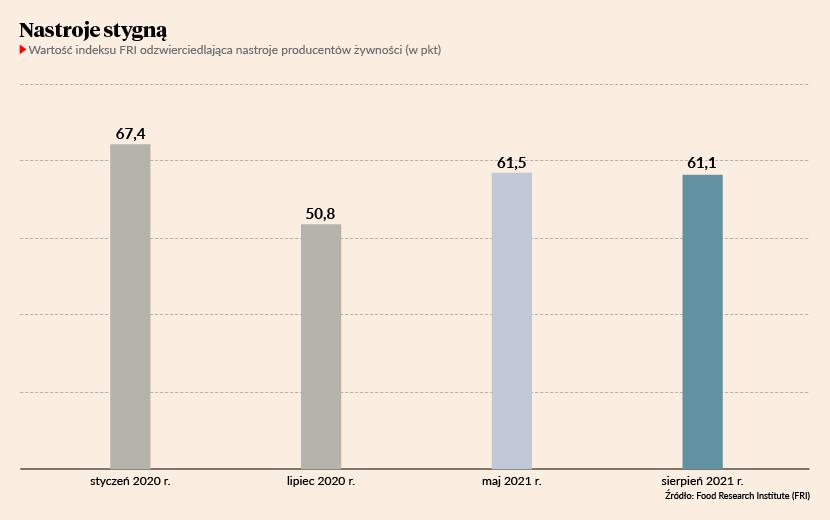 Indeks Food Research Institute (FRI), określający nastroje menedżerów z rynku przetwórstwa rolno-spożywczego, wyniósł w maju 61,5, a trend zapowiadał powrót w sierpniu do poziomu sprzed pandemii. Zamiast tego wskaźnik spadł do 61,1.