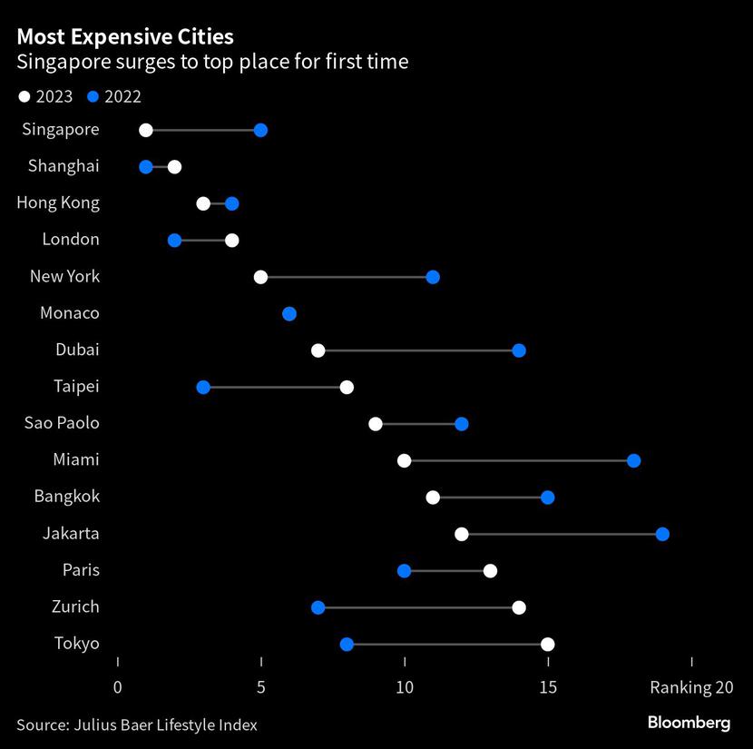 Azjatyckie miasto-państwo w ubiegłym roku było na piątym miejscu, a teraz znalazło się na pierwszym. Zaraz po nim uplasowały się odpowiednio Szanghaj i Hongkong. Singapur po otwarciu swoich granic po pandemii chce zwiększyć swoją atrakcyjność dla bogatych osób, co znajduje odzwierciedlenie w gwałtownie rosnących cenach. Do końca 2022 r. znajdowało się w nim ok. 1,5 tys. biur rodzinnych, czyli dwa razy więcej niż rok wcześniej. Jest również najdroższe pod względem cen samochodów.