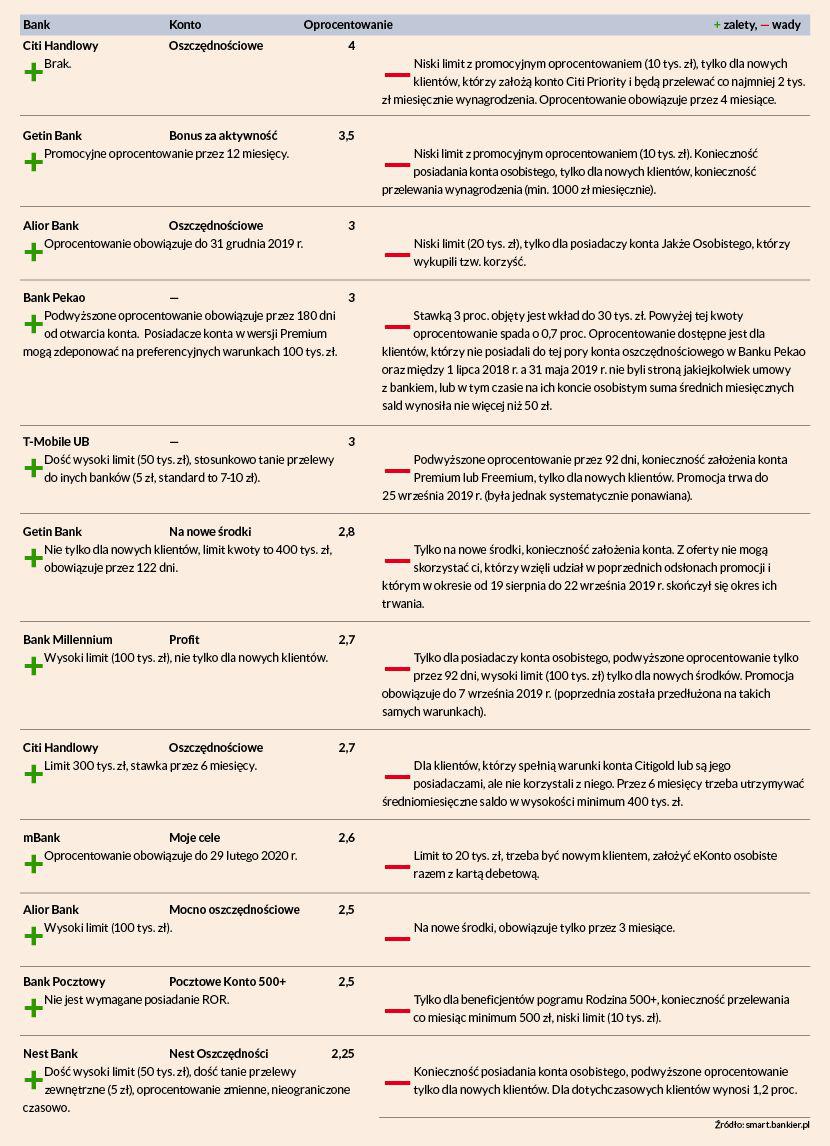 Nawet 100 tys. zł można zdeponować w Banku Millennium, który oferuje 2,7 proc. na koncie Profit nie tylko nowym klientom. W Citi Handlowym można zyskać 3 albo 4 proc., ale pierwsza propozycja skierowana jest do najbardziej zamożnych klientów, druga — dla tych średnio zamożnych, którzy rozpoczną korzystanie z usług banku. W mBanku, który wyróżnił się podniesieniem stawki z 2,5 do 2,6 proc. na koncie „Moje cele” też trzeba być nowym klientem, ale selekcji dochodowej nie ma. Jest za to dość niski limit depozytu (20 tys. zł), co częściowo rekompensuje dość długi okres oszczędzania (do 29 lutego 2020 r.). Z szerokiej czołówki wypadł Santander, który oferował do niedawna 2,7 proc. na koncie „Systematycznym”, ale obecnie proponowane oprocentowanie to 1,5 proc.