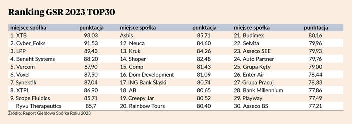 Ze spółek z pierwszej dziesiątki rankingu Giełdowa Spółka Roku 2022 w kolejnej edycji w czołówce ostało się ich aż pięć: XTB, Cyber_Folks, Benefit Systems, Synektik i Ryvu Therapeutics. Ta ostatnia, poprzedni zwycięzca, straciła nieco w oczach specjalistów i osunęła się na dziewiątą pozycję. Znacznie bardziej loty obniżyła Selvita (zajęła 22 miejsce w GSR 2023), wicelider rankingu za 2022 r. i lider w 2021 r. Powód jest oczywisty: przychody firmy przestały rosnąć, zyski znacznie spadły (zysk netto po trzech kwartałach 2023 r. jest o 70 proc. niższy r/r), a w ślad za tym spadł kurs (przez ostatni rok o 31 proc.).