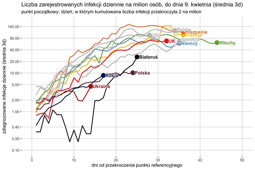3. W Polsce liczba zainfekowanych dziennie na 1 mln osób ustabilizowała się, spadki notowane są w krajach Europy Zachodniej, wyskok widać natomiast na Białorusi.