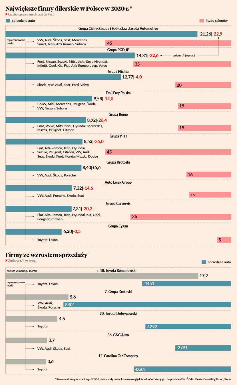 DCG Dealer Consulting Group oraz Instytut Badań Rynku Motoryzacyjnego Samar opublikowały kolejną listę największych polskich dilerów i grup dilerskich. Liderem rynku w 2020 r. została Grupa Cichy-Zasada. Za pośrednictwem 45 salonów, dziewięciu marek w 12 polskich miastach sprzedała blisko 21,3 tys. nowych samochodów. Wyprzedziła (o blisko 7 tys. sztuk) zeszłorocznego lidera, Grupę PGD-IP, która w 35 salonach 13 marek sprzedała nieco ponad 14,3 tys. aut. Na trzeciej pozycji — podobnie jak rok temu — uplasowała się Grupa Plichta. 20 salonów wchodzących w jej skład i specjalizujących się w autach Grupy VW i Volvo sprzedało blisko 12,8 tys. aut.