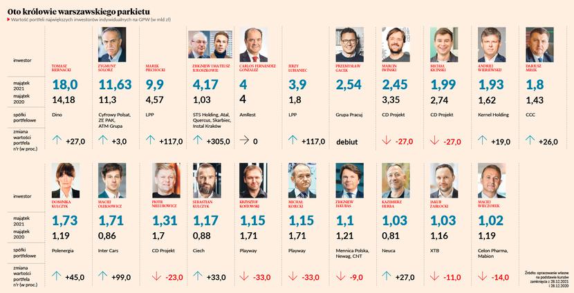 Debiutantem w zestawieniu jest Maciej Oleksowicz, prezes spółki Inter Cars. Na początku 2021 r. otrzymał akcje spółki w darowiźnie od ojca, Krzysztofa, a w kolejnych miesiącach kurs dystrybutora części motoryzacyjnych mocno wzrósł. W końcu roku giełdowym miliarderem stal się również Przemysław Gacek, współtwórca i główny akcjonariusz Grupy Pracuj, która zadebiutowała w grudniu po wartej 1,1 mld zł ofercie publicznej. Mimo spadku kursu w debiucie majątek przedsiębiorcy na GPW jest wyceniany na ponad 2,5 mld zł, co sprawia, że w zestawieniu znalazł się wysoko, m.in. przed twórcami CD Projektu.