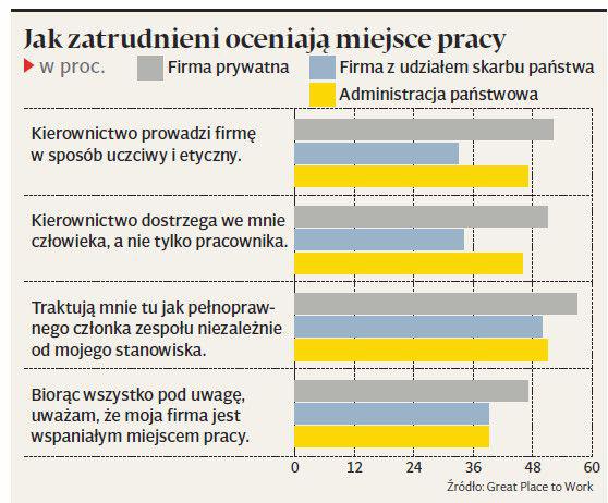 „Biorąc wszystko pod uwagę, uważam, że moja firma jest wspaniałym miejscem pracy”. Kto zgadza się z tym stwierdzeniem? Tylko 43 proc. zbadanych przez instytut Great Place to Work. I o wiele częściej są to pracownicy przedsiębiorstw prywatnych (47 proc.) niż administracji państwowej i spółek skarbu państwa (po 39 proc.), choć wydawać by się mogło, że są szczytem pracowniczych marzeń m.in. ze względu na bezpieczeństwo zatrudnienia i finansowe bonusy, np. premie jubileuszowe lub „13”.