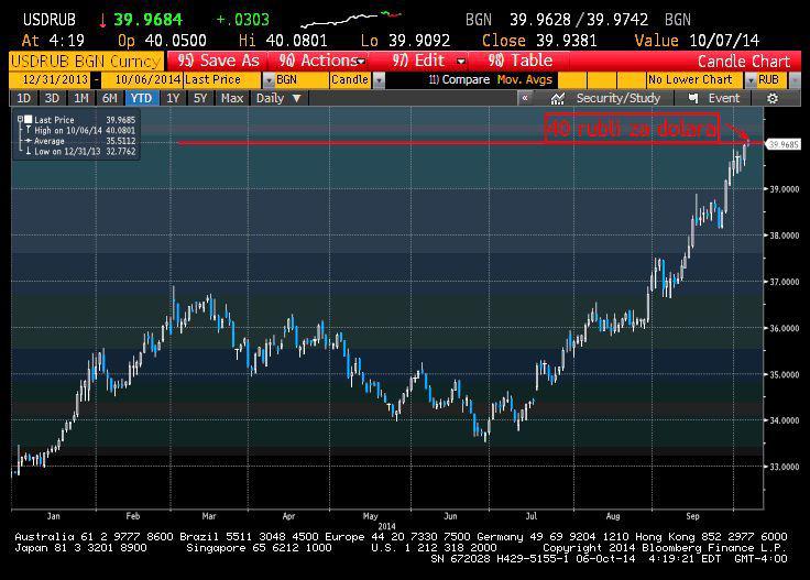 Krótko po 10:00 czasu lokalnego w Moskwie wartość rubla spadła do 40,046 za dolara. To kolejne historyczne minimum. Rubel stracił od początku roku prawie 22 proc. wobec dolara. Tylko w trzecim kwartale stracił prawie 15 proc., najwięcej od 1999 roku. Rosyjska gospodarka cierpi nie tylko z powodu spadku wartości rubla, ale głównie przez taniejącą ropę.