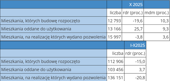 Liczba mieszkań, których budowę deweloperzy rozpoczęli w październiku 2025 r. spadła o 19,6 proc. rdr, a mdm wzrosła o 10,3 proc. - podał Główny Urząd Statystyczny.