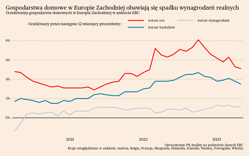 Promykiem nadziei jest stopniowe zmniejszanie się skali zapaści oczekiwanych dochodów realnych. Przez najbliższe miesiące będzie to nadal spadek, ale wolniejszy, więc presja na redukcję popytu z tej strony będzie słabnąć. Jednocześnie najważniejsza część tego dostosowania przypada na spadek oczekiwanej inflacji. Ułatwi to dalszą dezinflację, ponieważ dostosowanie wynagrodzeń realnych poprzez wzrost dynamiki wynagrodzeń nominalnych mogłoby zakotwiczyć inflację na wyższym poziomie. Szczególnie w państwach Europy Zachodniej, gdzie większe znaczenie mają związki zawodowe, posiadające lepszą pozycję negocjacyjną w indeksacji płac do inflacji niż np. pracownicy w Polsce.