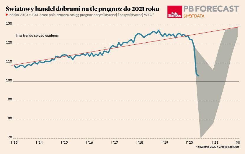 O 23 proc. spadł eksport strefy euro. Relatywnie najmniejsze straty na razie odnotował eksport z Chin (spadek tylko o 4 proc.) oraz Rosji i Wspólnoty Niepodległych Państw (o 5 proc.). W przypadku importu kolejność i skala strat jest podobna, poza Japonią, w której spadek importu (9 proc.) był o połowę mniejszy niż spadek eksportu (21 proc.). W świetle dostępnych danych pesymistyczny scenariusz z kwietniowej prognozy Światowej Organizacji Handlu (WTO) wydaje się mniej prawdopodobny. WTO opublikowała kilka miesięcy temu dwa scenariusze odniesienia — optymistyczny zakładający, że światowy handel skurczy się w 2020 r. tylko o 13 proc., oraz pesymistyczny ze spadkiem aż 32 proc. WTO szacuje, że globalny handel w drugiej połowie roku musiałby rosnąć tylko o 2,5 proc. kwartalnie, aby zrealizowana została optymistyczna prognoza. Zakłada ona, że w 2021 r. światowy handel wróci do poziomów, które wynikałyby z przedepidemicznych trendów. Oznaczałoby to, że epidemia nie wpłynęłaby na trwałe obniżenie ścieżki eksportu, ale była tylko przejściowym szokiem.