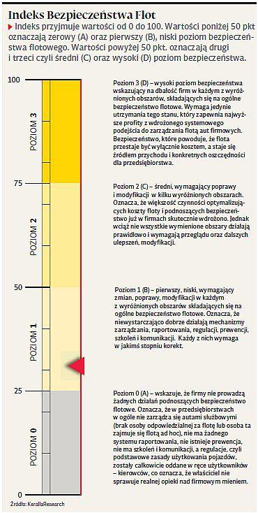— Wyniki badania wskazują, że małe i średnie firmy wykorzystujące auta w codziennej działalności mają przed sobą mnóstwo pracy. Indeks w 2012 r. kształtuje się bowiem na poziomie 30 punktów, co oznacza, że w przedsiębiorstwach świadomość kwestii związanych z bezpieczeństwem jest niewielka — mówi Sylwester Pawłowski, ekspert do spraw bezpieczeństwa floty w Safety Logic.