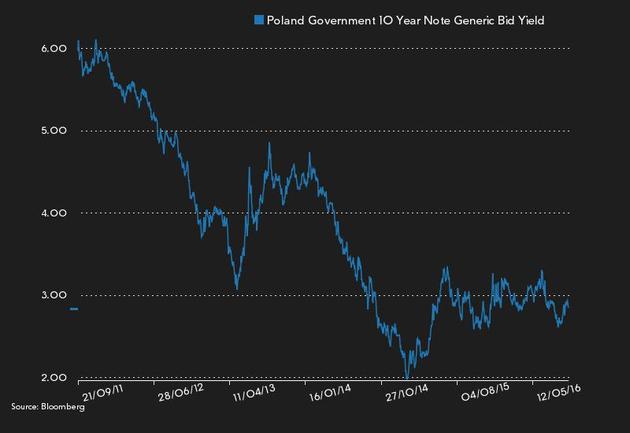 Rentowności 10-letnich obligacji skarbowych Polski, denominowanych w złotym, w ostatnich 5 latach. Im niższe rentowności, tym wyższe wyceny obligacji. Źródło: Bloomberg.