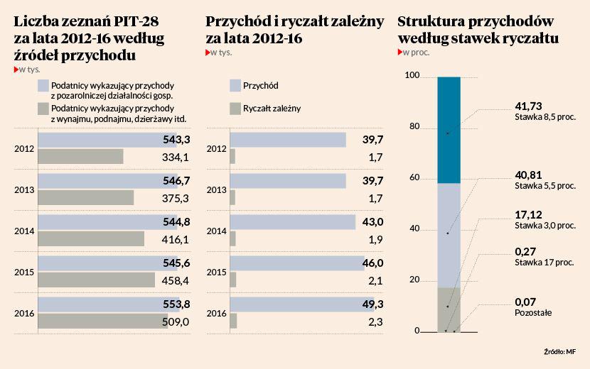 Z danych MF o zeznaniach PIT-28 za 2016 r. składanych przed rokiem wynika, że najwięcej podatników (ponad 200 tys.) osiągało przychody z działalności gospodarczej ze stawką opodatkowania 8,5 proc., a najmniej (431) z 20 proc. zryczałtowanym PIT. Z tego podatku mogą korzystać przedsiębiorcy prowadzący działalność nie tylko samodzielnie, na własne nazwisko.