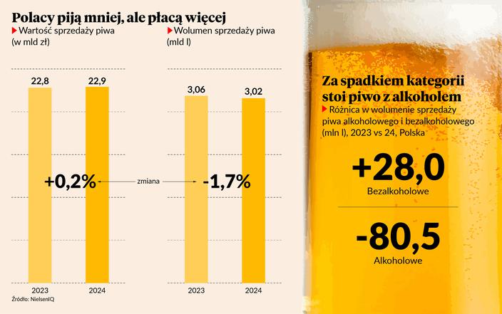 Najmocniej tracą alkoholowe lagery, których sprzedaż spadła o 3,1 proc., oraz piwa mocne — tu spadek wyniósł 3,8 proc. Rośnie natomiast sprzedaż piw bezalkoholowych, które coraz śmielej zbliżają się do dwucyfrowego udziału w rynku. Wolumenowo ten segment zwiększył się w zeszłym roku o 17,4 proc., sięgając 6,4 proc. rynku. Wartościowo, przy wzroście o 16,8 proc., piwa bez procentów stanowią już 7,5 proc. rynku, a ich sprzedaż przekroczyła 1,7 mld zł. To niemal 250 mln zł więcej niż rok wcześniej.