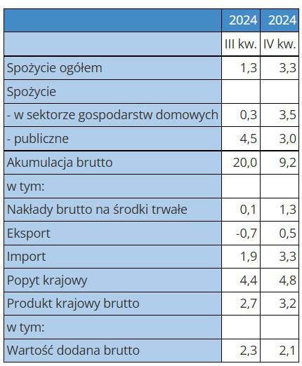 "Wzrost PKB w IV kwartale potwierdzony na 3,2 proc. r/r. Struktura też bez zaskoczeń - motorem była konsumpcja prywatna (3,5 proc. r/r), inwestycje dalej z dodatnim wkładem do wzrostu. Obraz dopełnia ujemny wkład eksportu netto i dalsza odbudowa zapasów. To niezły prognostyk dla oczekiwanego przez nas wzrostu PKB w 2025 r. z 4-ką z przodu, napędzany głównie przez inwestycje i konsumpcję prywatną" - zwrócili uwagę ekonomiści z Pekao.