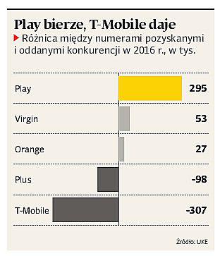 To jednak w jego przypadku wynik aż o jedną trzecią gorszy niż rok wcześniej. Bardzo dobrze w statystykach wypadł Virgin Mobile, największy operator wirtualny na rynku, który zdobył o 52 tys. więcej numerów, niż stracił. Na plusie — choć dwa razy mniejszym niż Virgin — rok zakończyło także Orange, które rok wcześniej było na minusie. Klientów tracą natomiast Plus i T-Mobile. Ten ostatni operator w 2016 r. był zdecydowanie największym dawcą numerów dla konkurencji — odeszło od niego do innych operatorów 520 tys. osób, a przyszło tylko 210 tys.